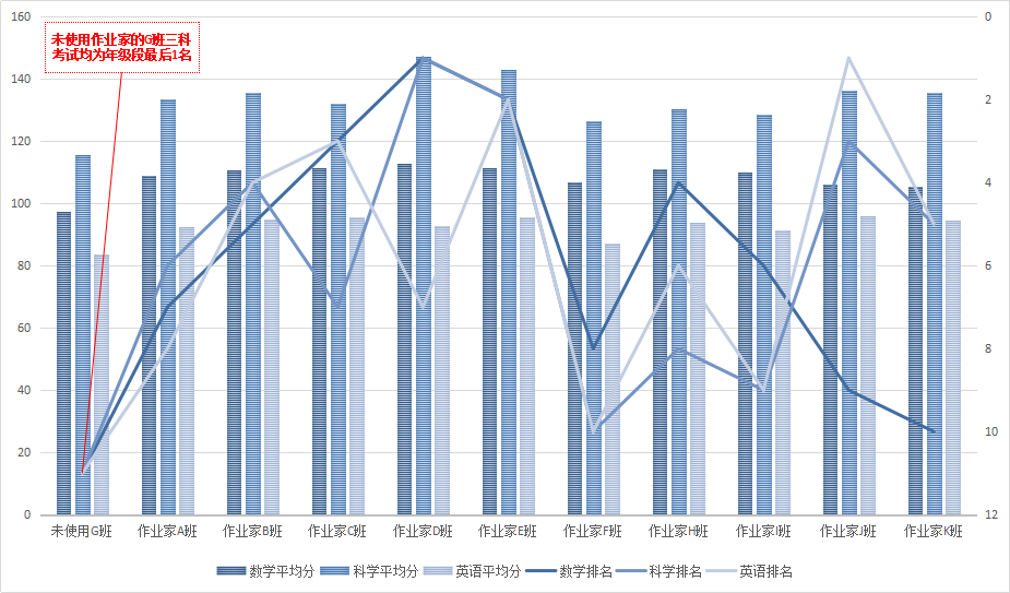 2019年秋季学期期中考试,将初一年级5门科目平均分进行比较,发现G班每一门科目的平均分都是年级段最后1名。而其他班级的成绩则与使用量呈正相关关系;2019年秋季学期期末考试,该校初一年级总评成绩全区第一(与第二名分差达15分)。