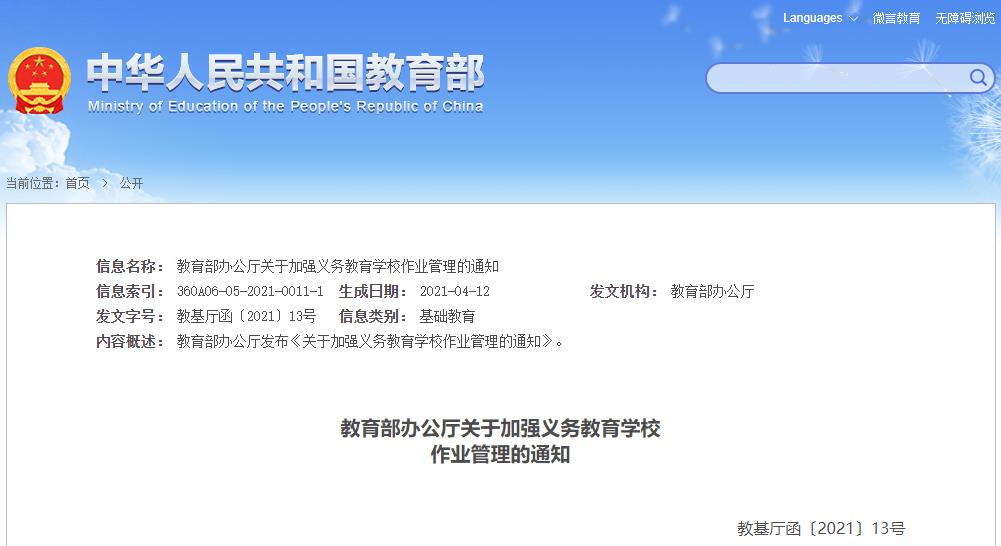 为贯彻落实中央有关精神,进一步规范学校教育教学管理,全面提高教育教学质量,坚决扭转一些学校作业数量过多、质量不高、功能异化等突出问题,日前,教育部印发《关于加强义务教育学校作业管理的通知》,具体内容如下: