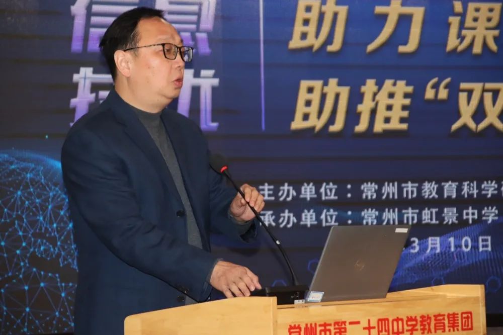为进一步践行“双减”教育政策,深化课堂教学改革,推动信息技术与课堂教学融合,2022年3月10日常州市教育科学研究院主办的国家级信息化教学实验区(常州)建设交流展示活动在常州市虹景中学举行。教育局纪忠副局长、戚宝华副局长、教育科学研究院潘小福副院长、常州市第二十四中学教育集团张慧群校长、常州市教育局办公室水虎远副主任、常州市教科院教育技术中心徐展副主任、常州市教科院初中教育研究所杨波副所长、初中英语教研员刘芸、初中地理教研员朱志刚、局属各单位首席信息官(CIO)以及技术支持公司负责人出席本次活动。“第二批常州市教育信息化建设项目”负责人、其他学校CIO、初中英语数学地理学科教师通过观看网络直播的方式参与活动。