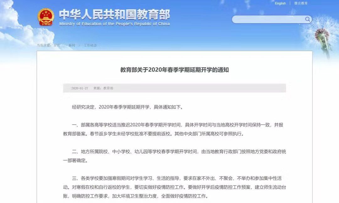 1月27日,教育部发布关于2020年春季学期延期开学的通知。