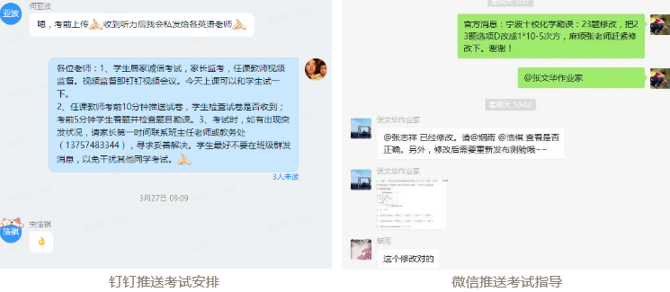 本次测试采用居家诚信考试,学生在规定时间限时完成并在线提交。考试期间家长全程监考,任课教师通过钉钉视频会议在线监督。班主任考前围绕在线测试的难得性、重要性与学生进行交流,并要求学生在考场布置、应考策略、网络、设备问题的应急反应等方面做好充足的心理和行动准备。