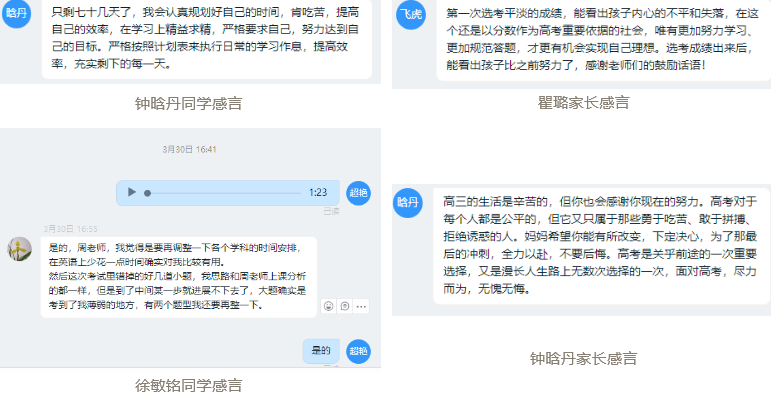 高三(3)班:“圈定”薄弱学科学生,与学生和家长进行电话或微信沟通,给予其自信心,并与任课教师进一步加强联系,“跟踪”学生作业情况,做好引导和保障工作。